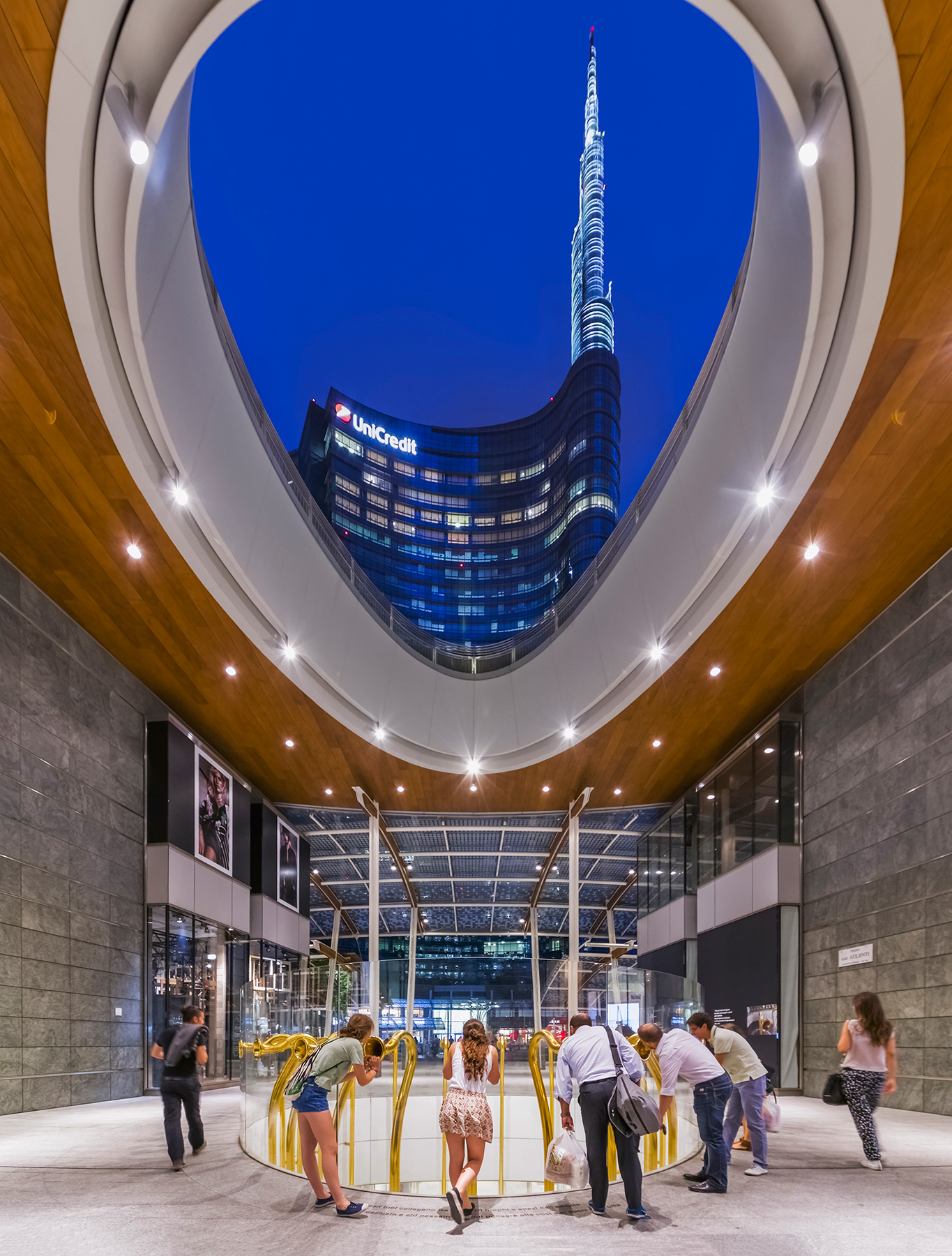 Around the piazza, a ring-shaped canopy connects the podiums of the three towers. Two levels of shops are above the piazza, with additional retail and dining at the sunken level, while the podium contains parking and a direct connection to the Stazione Garibaldi rail station.