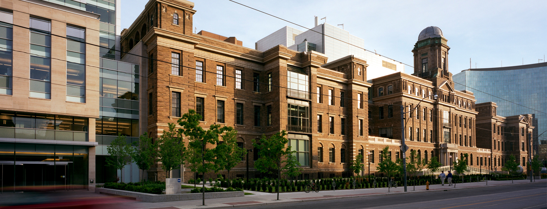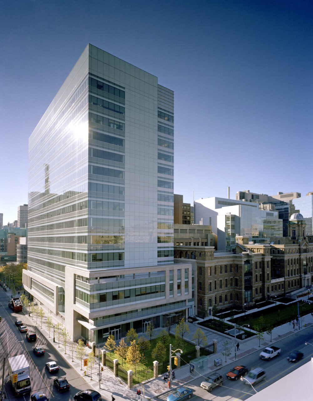 The design direction for the new research towers and atrium was based on cues from the architectural principles expressed in the façade of the heritage building. The goal was to achieve compatibility between the new architecture and that of the historic building while retaining continuity of the existing urban character of the city block.