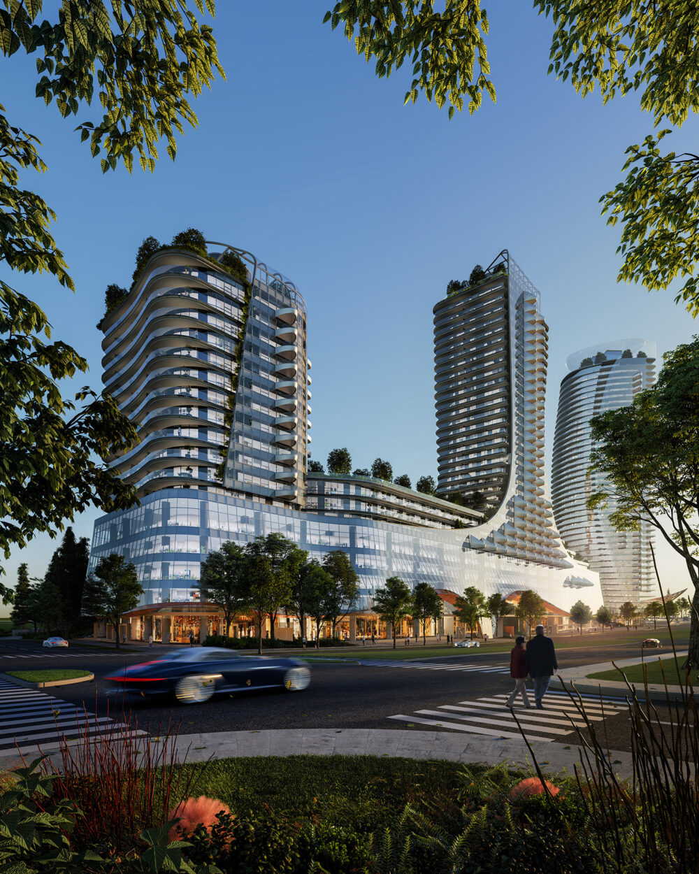 This mixed-use development consists of approximately 4.3 million square feet above and below grade, not including the residential buildings. The Master Plan was designed by Henriquez Partners Architects as a single, mixed-use development that includes residential, office, retail, civic uses, and park above a consolidated below-grade parking garage. The architectural vocabulary of the towers draws inspiration from the park and appear as if they are emerging from the park, terracing up with integrated planting.