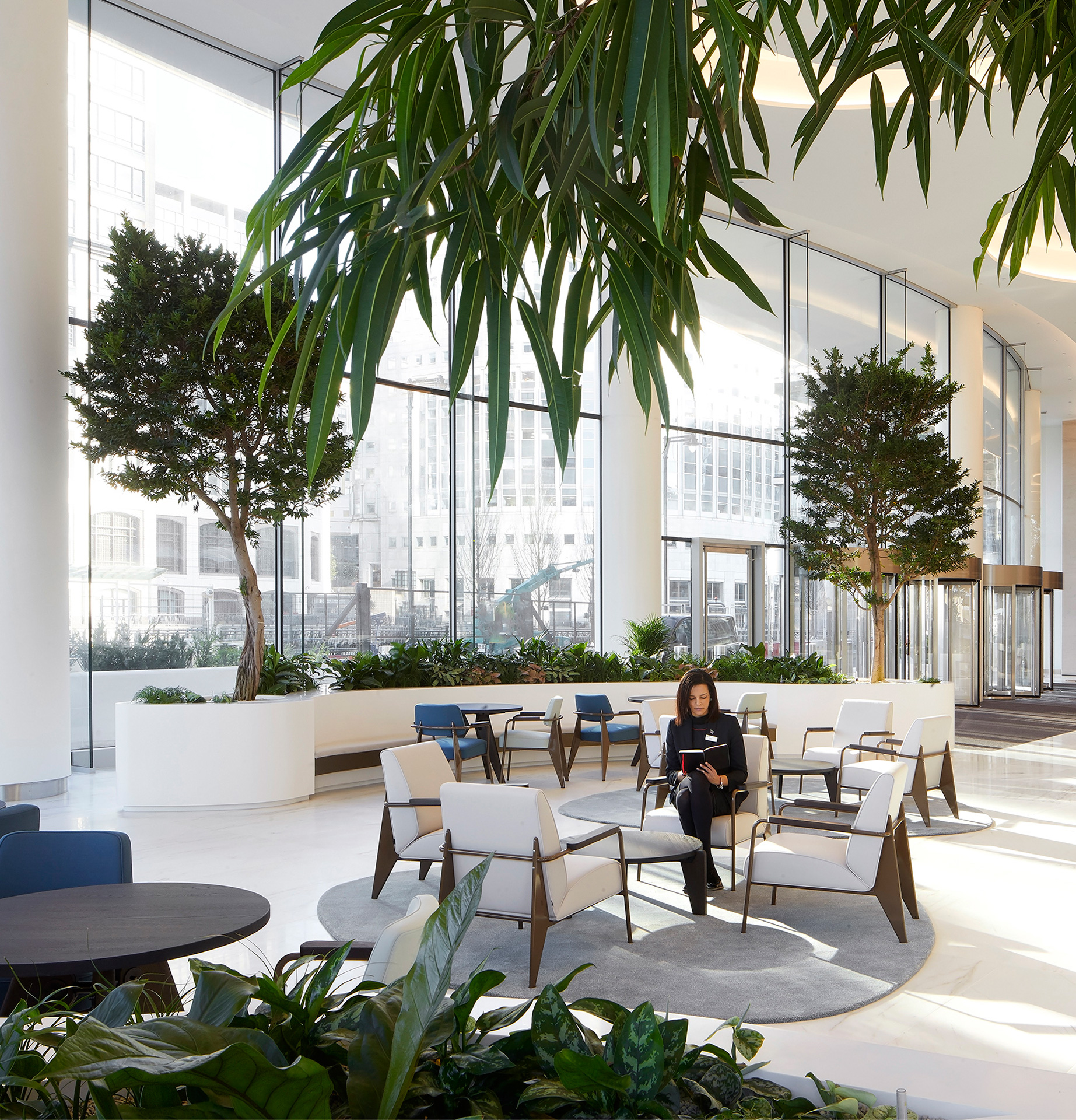 On the lower levels large trading floor plates push into the curved façade while the main office floors above ‘pull back’ from the busy street. A roof deck directly above the trading floors, at the base of the sweeping west façade, offers an open green space for tenants to enjoy. Views from the terrace, and multiple internal balconies are positioned to maximize views over the River Thames and across the city. A pedestrian promenade to the south is included as part of a high-grade external public realm, complete with planters, green wall, retail kiosks and sunken seating areas along the water’s edge.