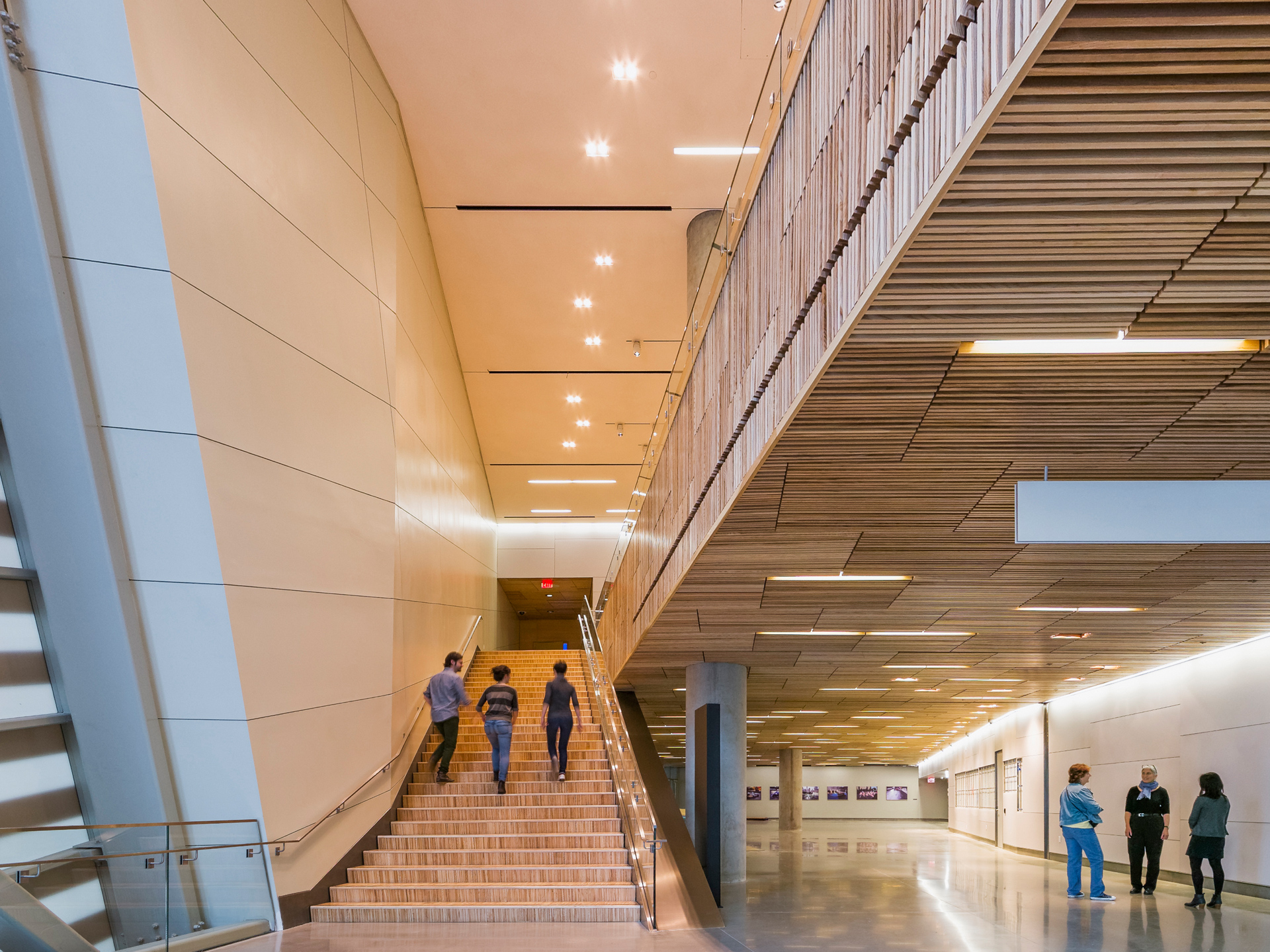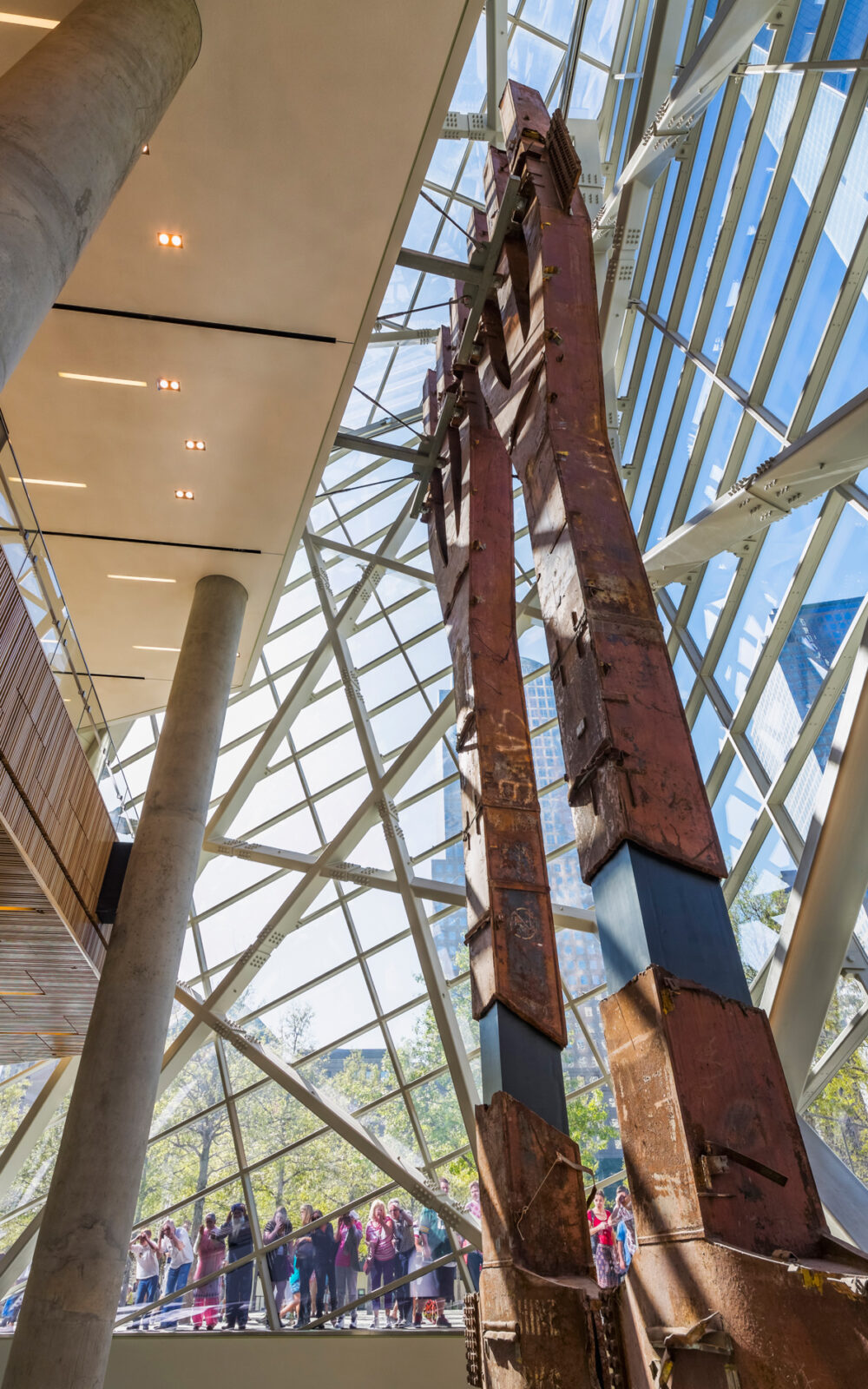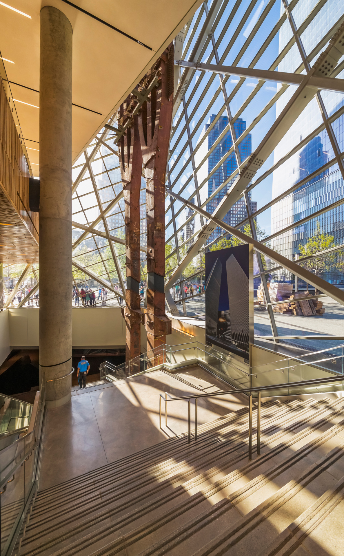 A significant aspect of the Pavilion’s identity is formed around a large glazed atrium situated over the Museum’s Memorial Hall and near the center of the Memorial Plaza. The atrium allows visitors to see into the Museum where two large steel tridents, authentic structural elements recovered from the former towers, are on display. The two tridents create an immediate visual reference to the Twin Towers.