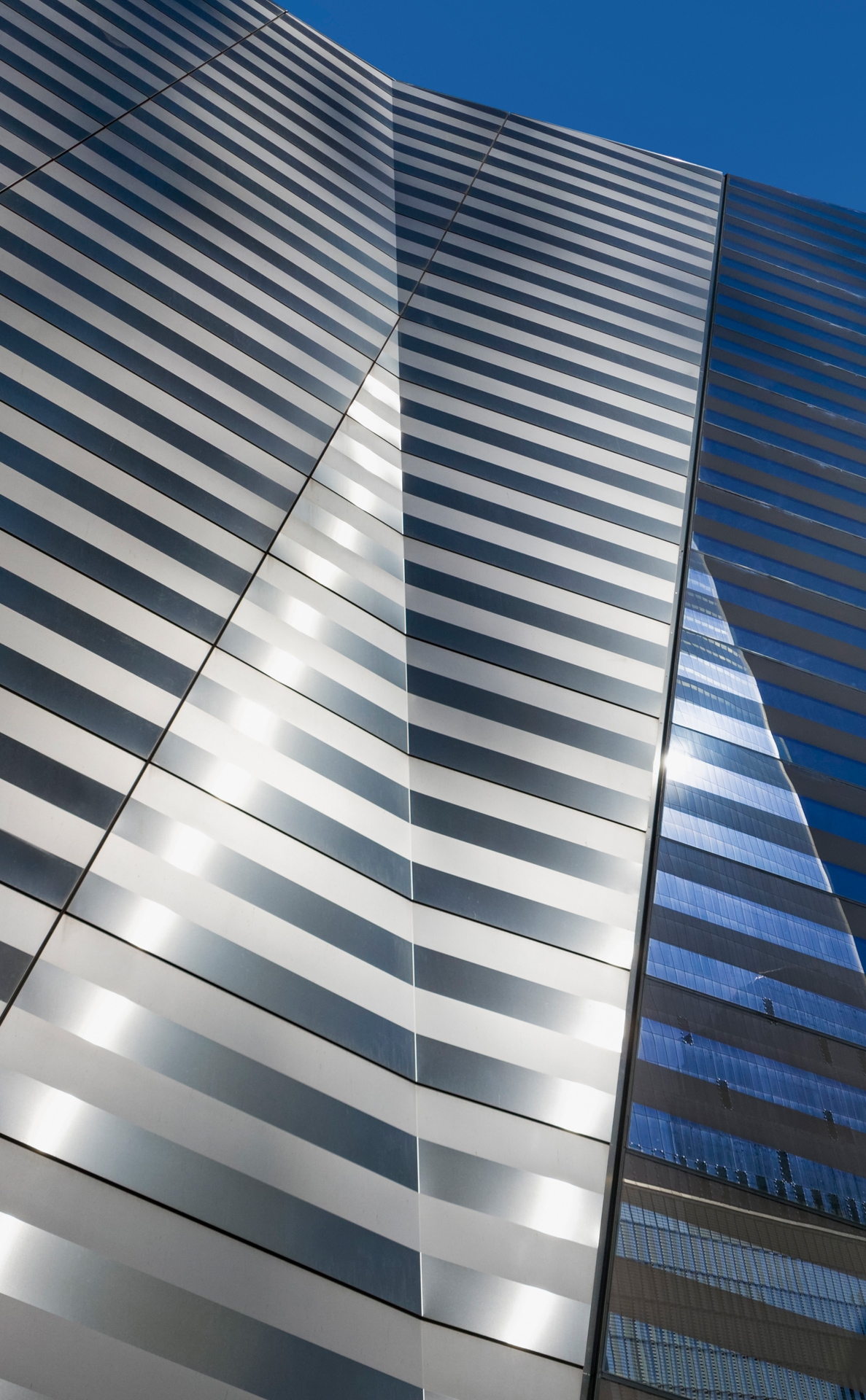 Designed by Norwegian architectural firm, Snøhetta, the program includes ticketing and main entrance to the museum, security screening, auditorium, and family room. The Museum Pavilion is the primary structure above ground at the Memorial site, serving to guide pedestrian traffic and to provide a visual point of reference within a large area surrounded by several high towers. Its low, horizontal form can be seen easily from all directions and provides a sense of intimacy in an otherwise overwhelming urban space. The exterior of the building is clad primarily in metal that is composed of varying reflective surfaces, the subtle design of which is reminiscent of the façade of the former WTC towers.