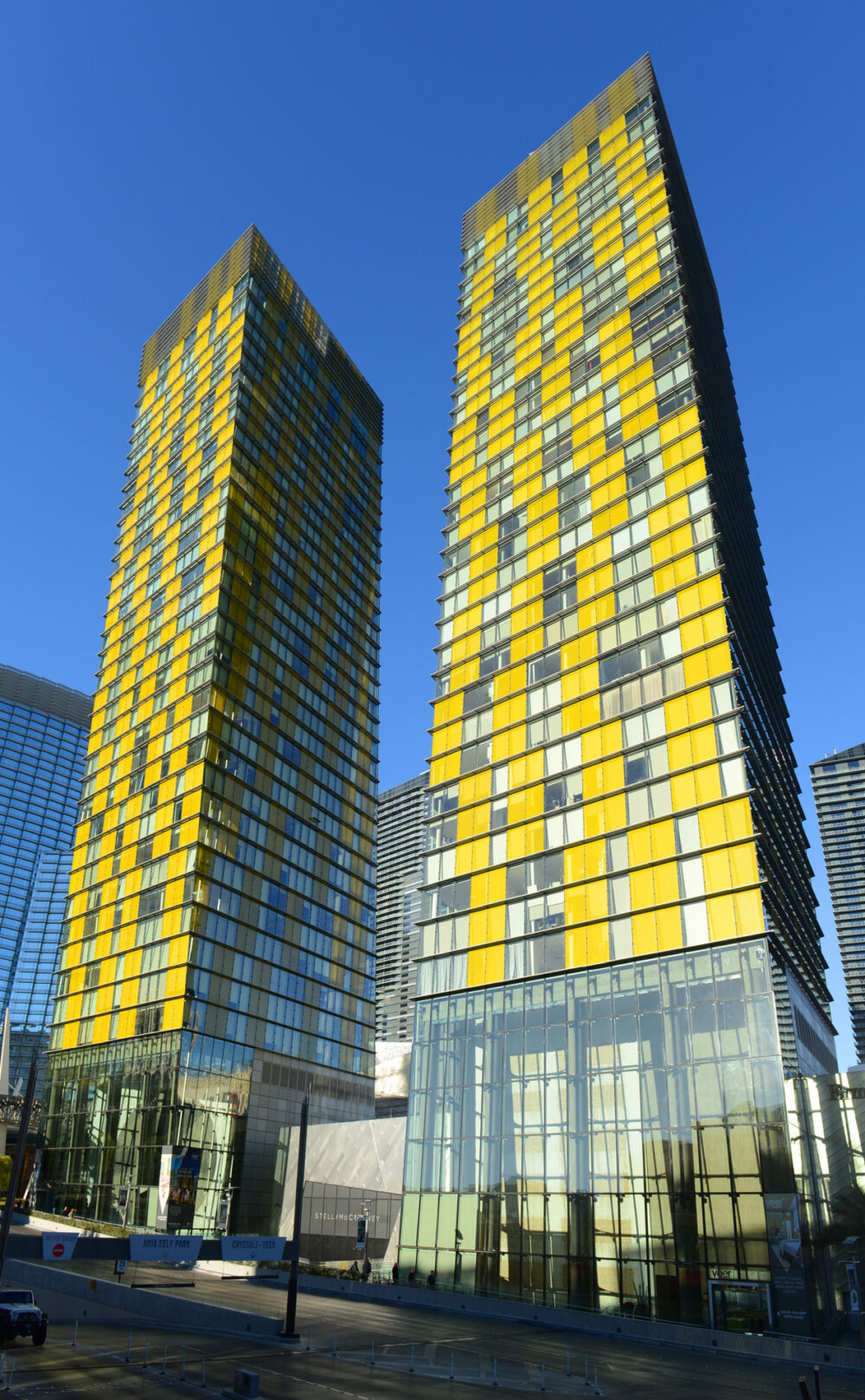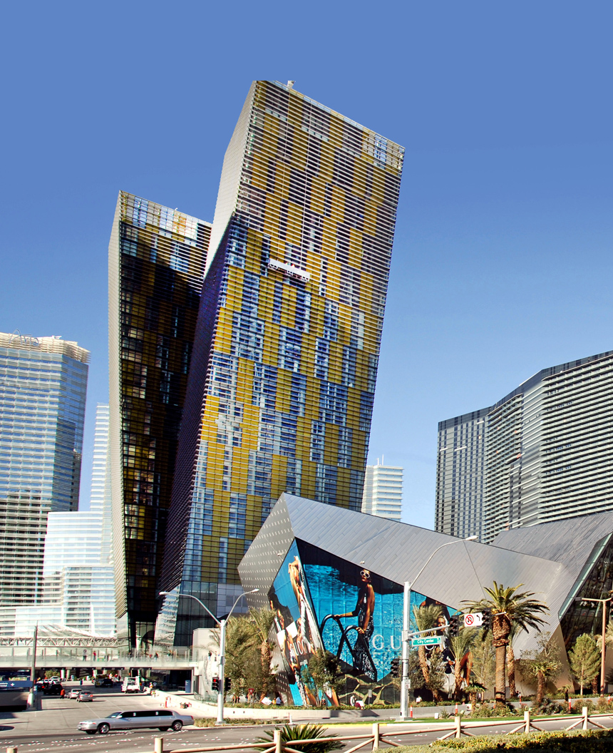 The composition of Veer Towers is based on two 473-foot-high residential towers inclined at five-degree angles.